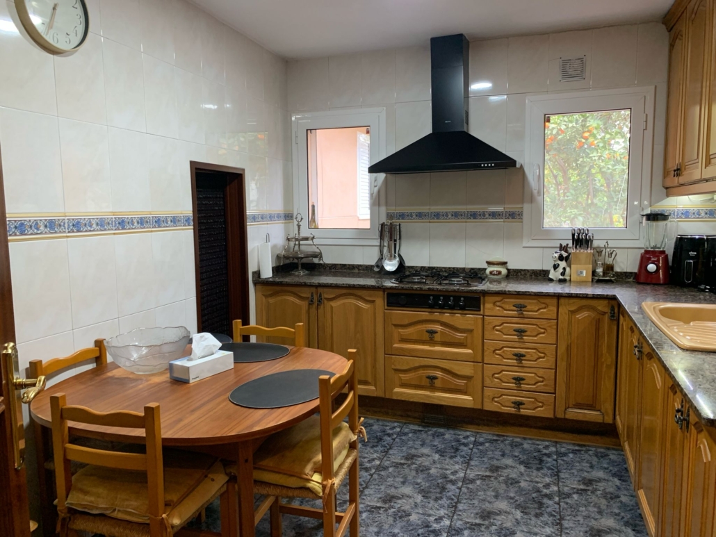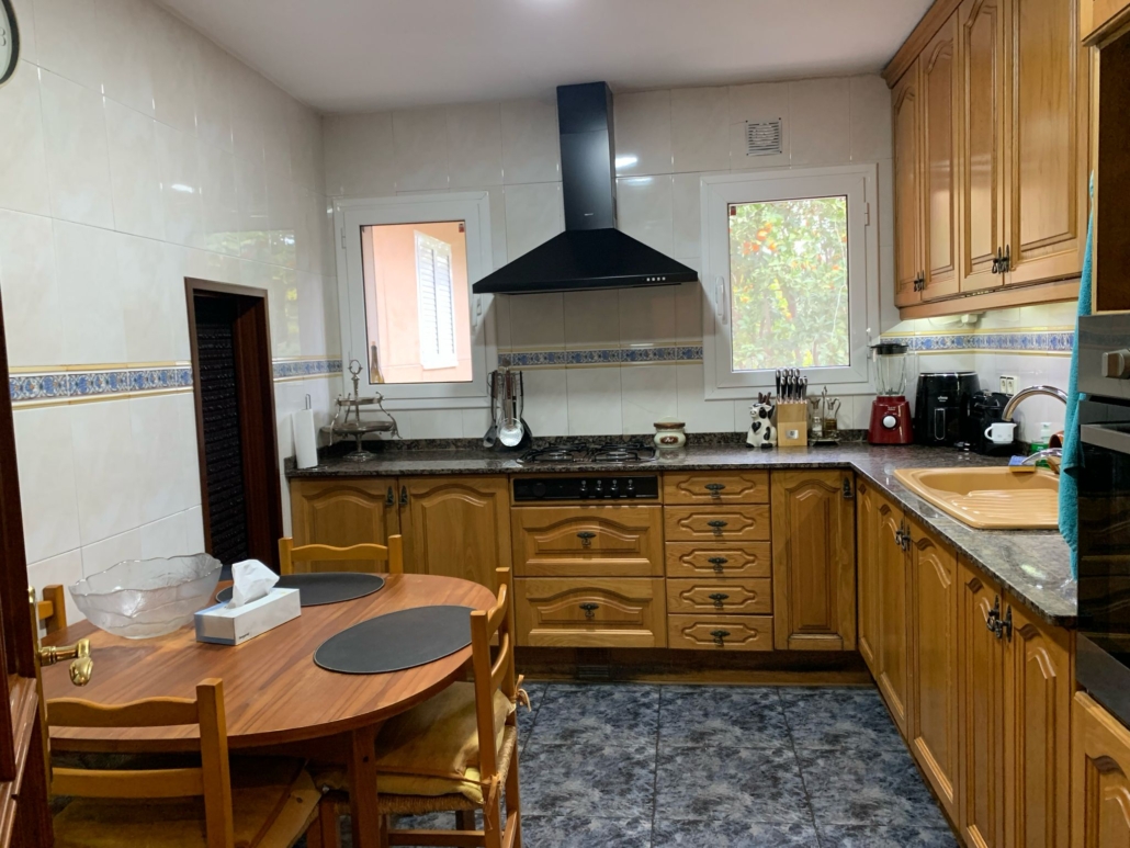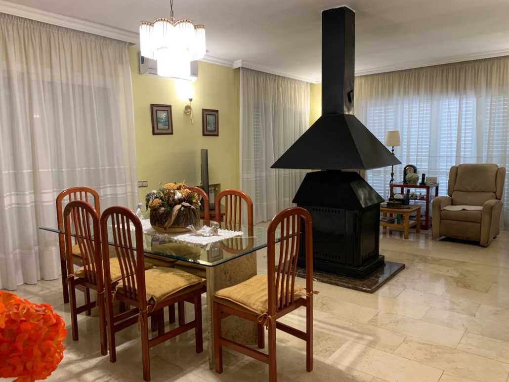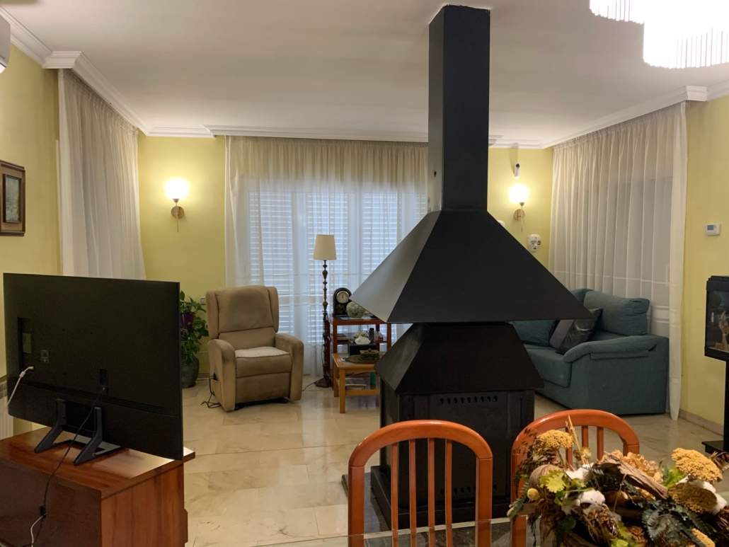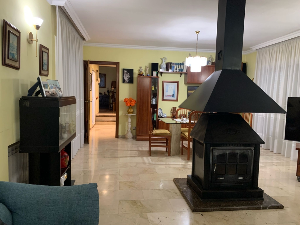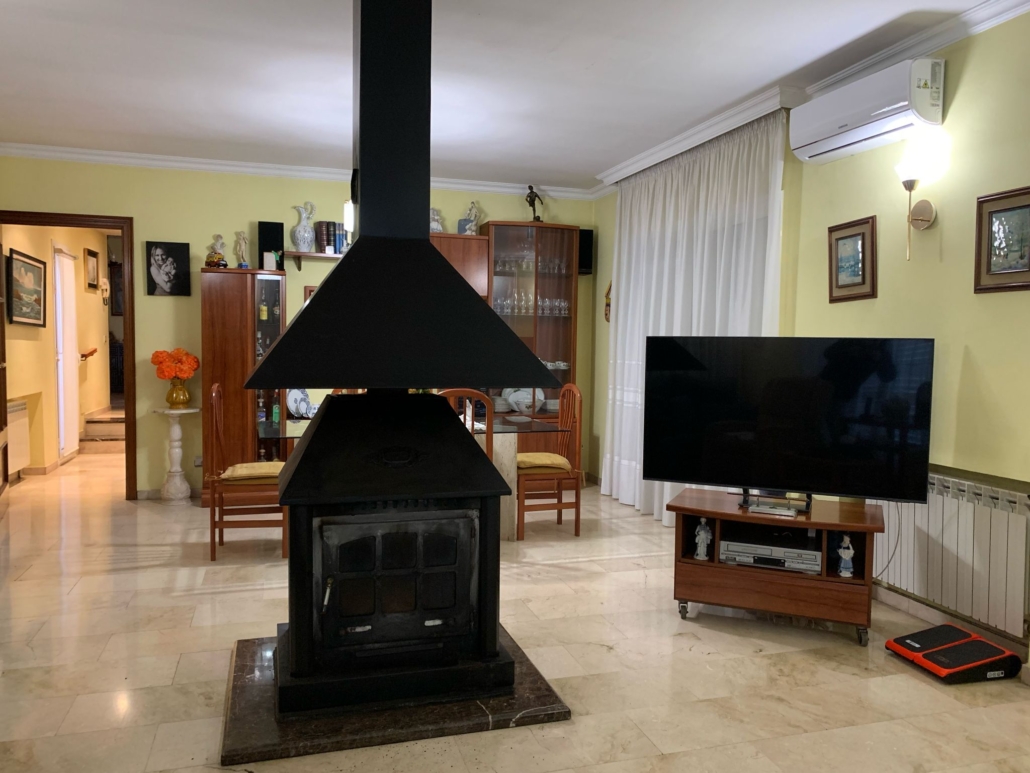 En esta misma planta, bajando dos peldaños accedemos a la cocina office totalmente equipada, que además dispone de despensa. El salón-comedor de 40 m² (A/A con bomba de calor), muy amplio, cuenta con chimenea central, que aporta un carácter especial a la estancia y con salida a una gran terraza de 50 m2 con barbacoa, ideal para organizar reuniones familiares y disfrutar de la naturaleza.