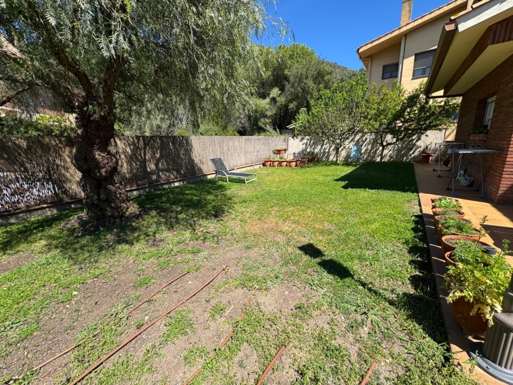 Parcela que rodea toda la vivienda con diferentes ambientes: comedor exterior, bonito jardín y una zona amplia y plana para hacer piscina con salida directa de salón y cocina.